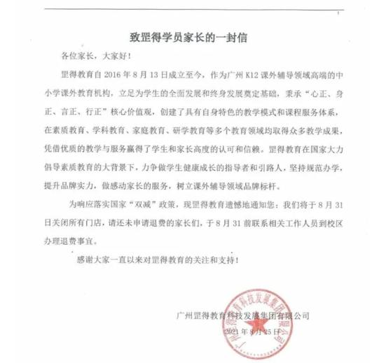 8月25日,罡得教育在其官方微信公众号发布《致罡得学员家长的一封信》,宣布将于8月31日关闭所有门店,请还未申请退费的家长联系相关工作人员到校区办理退费事宜。