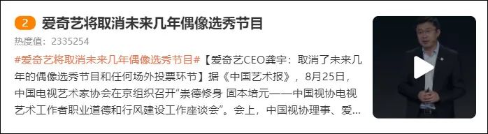 8月26日,在中国电视艺术家协会组织召开的座谈会上,视协理事、爱奇艺创始人、首席执行官龚宇表示,爱奇艺联合其他平台始终坚持与行业不正之风划清界限,抵制不合理片酬、抵制行业不正之风,抵制偷税漏税,并取消了未来几年的偶像选秀节目和任何场外投票环节。