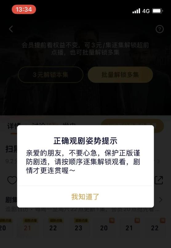 腾讯视频在《扫黑风暴》的超前点播中,既然是按集收费的,那消费者就有权选择他要看的那一集。所谓“按顺序解锁观看”,涉嫌捆绑销售,是对消费者选择权的漠视。