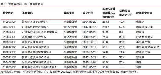 截至二季度末,管理规模前十的公募量化产品管理规模合计1007亿,包括8只指数增强型产品、2只量化对冲型产品。其中,管理规模前三的产品分别为易方达上证50增强、汇添富绝对收益策略、汇添富沪深300基本面增强,对应规模为 254.3亿、250.7亿、95.8亿。
