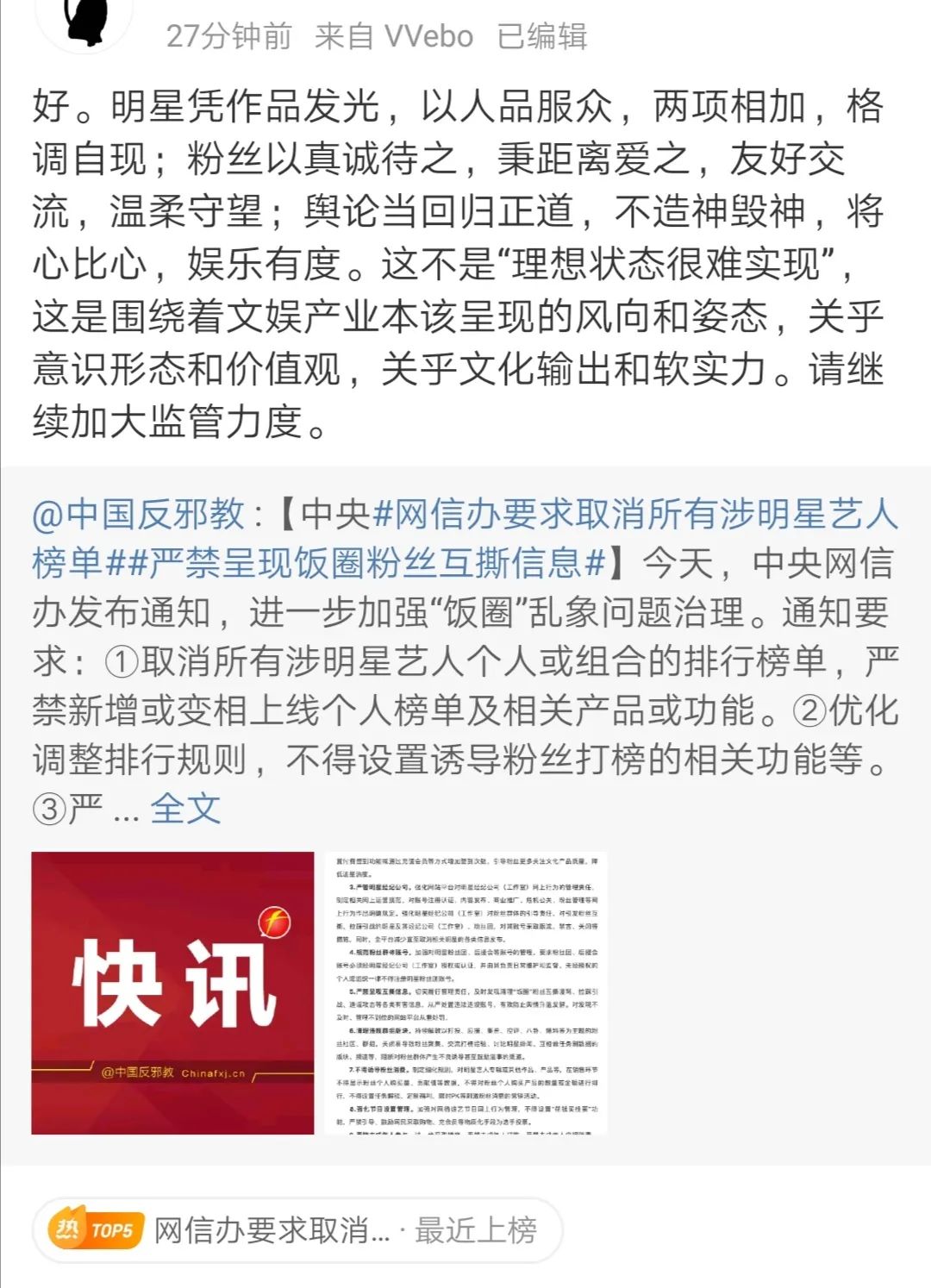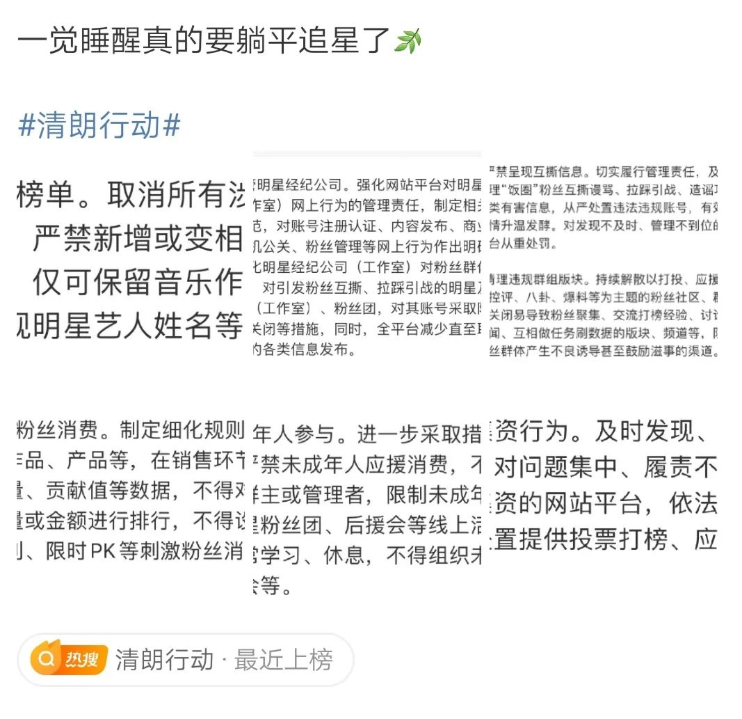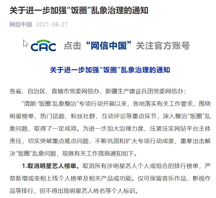 今天,中央网信办发布《关于进一步加强“饭圈”乱象治理的通知》,提出取消明星艺人榜单、严管明星经纪公司、严禁呈现互撕信息、严控未成年人参与等10项要求。