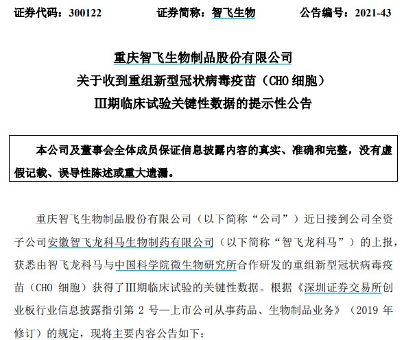 8月27日,重庆智飞生物制品股份有限公司(智飞生物,300122)发布公告称,公司全资子公司安徽智飞龙科马生物制药有限公司(简称“智飞龙科马”)与中国科学院微生物研究所合作研发的重组新型冠状病毒疫苗(CHO细胞)获得Ⅲ期临床试验的关键性数据,结果显示,对德尔塔(Delta)变异株的保护效力为77.54%。