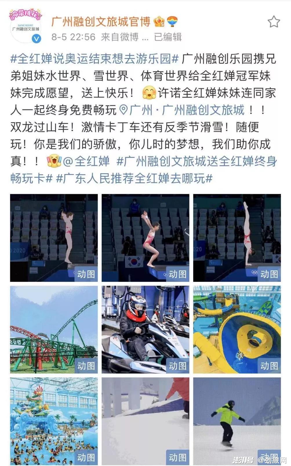 22:56分,@广州融创文旅城官博 跟进,宣布旗下雪世界、水世界等游乐业态对全红婵全家终身免费。