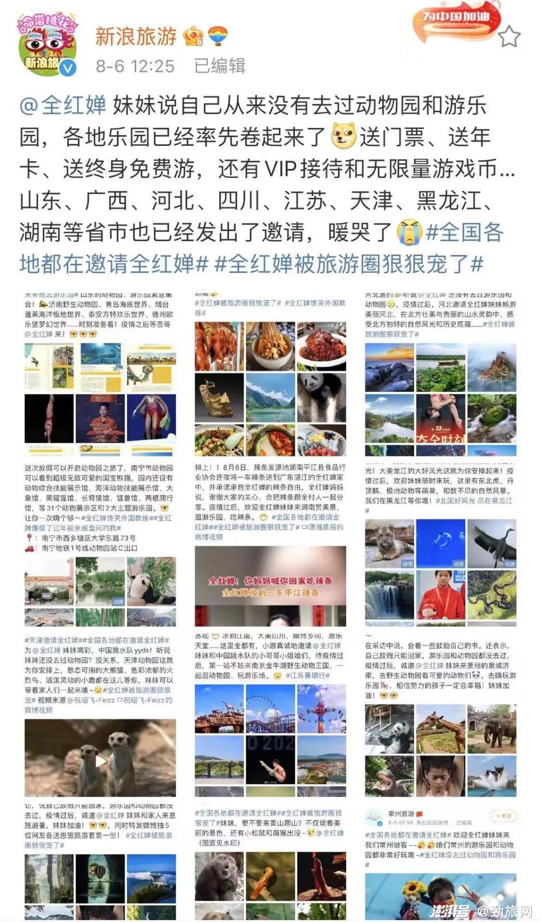 @新浪旅游 发起两大话题#全国各地都在邀请全红婵#、#全红婵被旅游圈狠狠宠了#,号召全国50+地方文旅局、80+景区参与互动,最终博文阅读量达790万+,转评赞超18万,话题则获得2.6亿阅读量和3.5万讨论量,让微博成为了全红婵热点事件的最大承载平台。