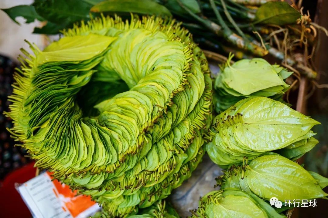 在缅甸的街头,随处可见售卖这种槟榔的小摊子,它们一般都非常简陋,有的是个小推车,有的是用旧木板搭成的,小摊子上摆满了瓶瓶罐罐,里面装着各种香料,旁边还有一叠一叠的新鲜绿叶,是用来包裹槟榔的,这种叶子叫蒌叶,有丁香的气味,咀嚼的时候有助于提神。萎叶,槟榔的最佳拍档
