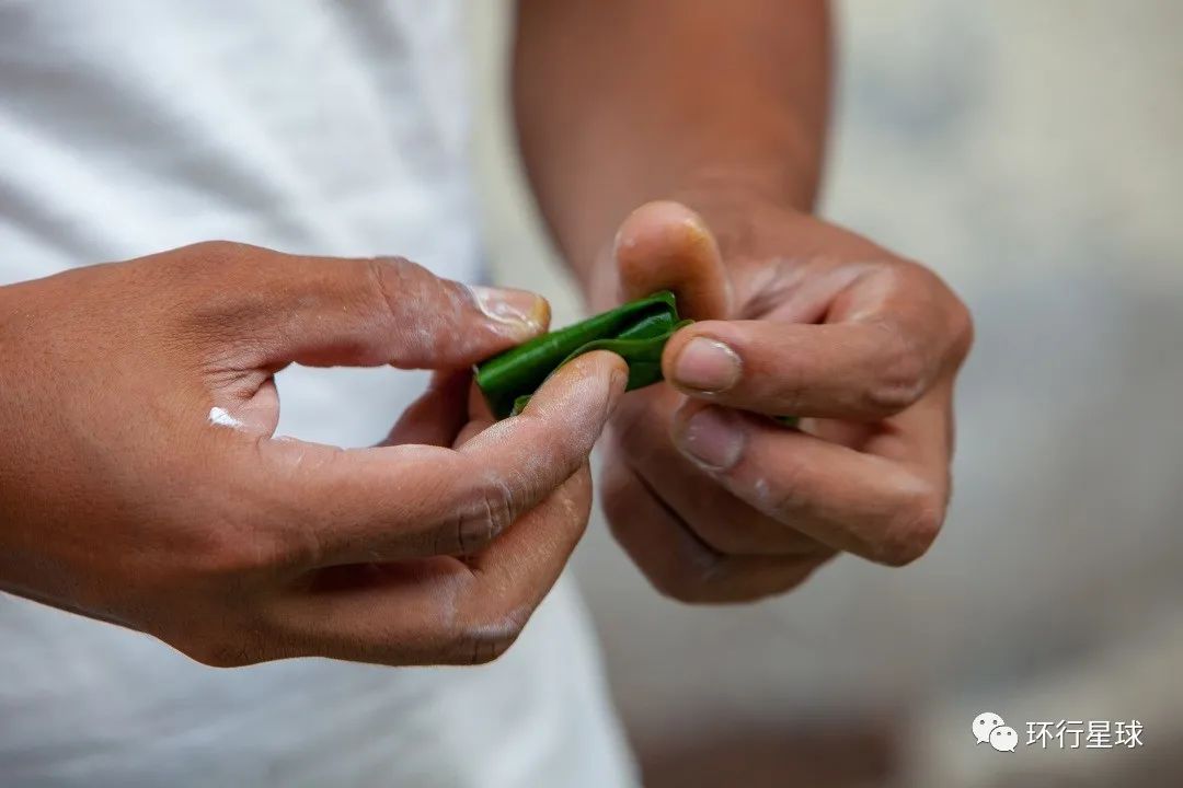 各种材料都放齐之后,就把叶子裹起来包好,一个成品槟榔就做好了,像个小粽子一样,缅甸人称之为“拱牙”。