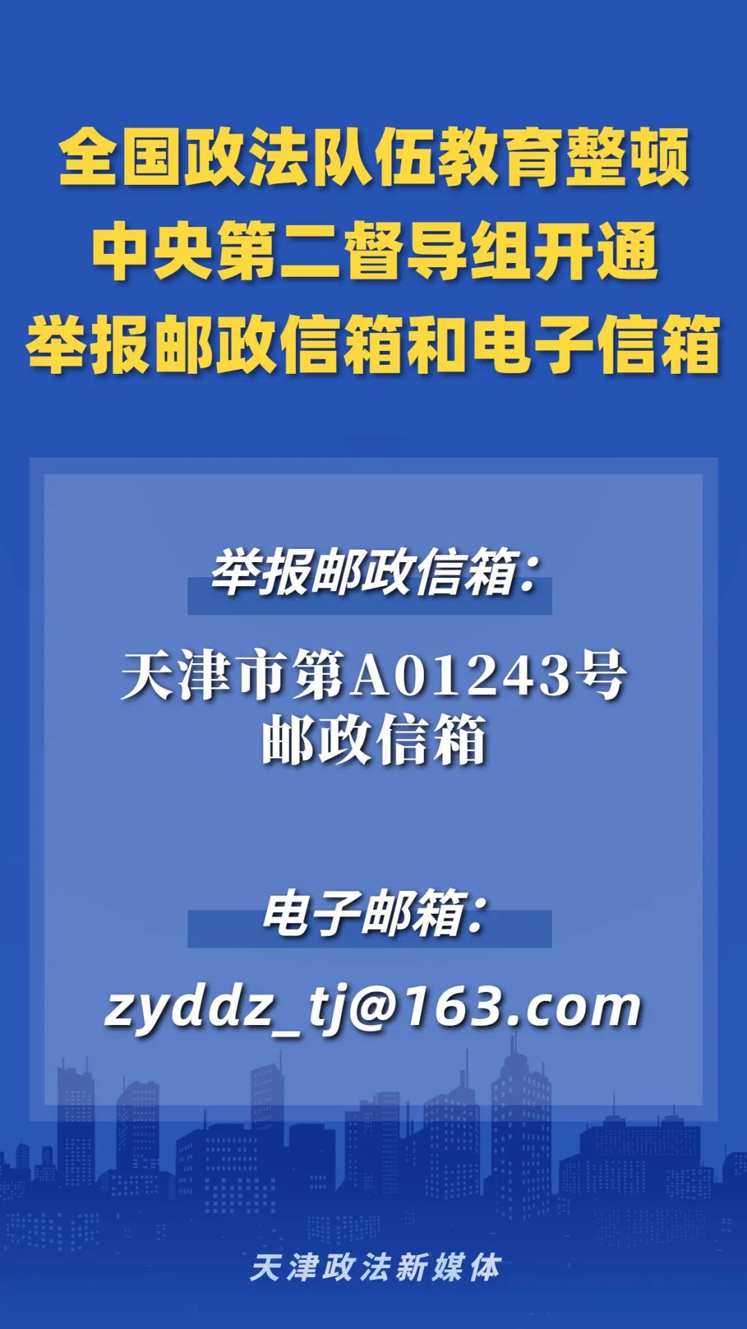 根据全国政法队伍教育整顿工作安排,中央第二督导组进驻天津市对第二批政法队伍教育整顿单位开展督导工作。督导组设立举报邮政信箱(天津市第A01243号邮政信箱)和电子邮箱(zyddz_tj@163.com),自公布之日起至10月31日期间受理反映中共天津市委政法委员会,天津市高级人民法院,天津市人民检察院,天津市公安局,天津市司法局和天津市监狱管理局、天津市戒毒管理局机关,天津市第一中级人民法院,天津市第二中级人民法院,天津市第三中级人民法院,天津海事法院,天津市人民检察院第一分院,天津市人民检察院第二分院,天津市人民检察院第三分院,以及有关直属单位、派出机构干警违纪违法问题的来信举报。其他不属于受理范围的来信,将按照规定交有关部门处理。