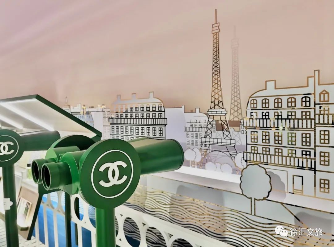 亭子前的许愿池泛着粼粼波光,走近细看,原来池中散落的许愿币,一枚枚都印着香奈儿香水的各种元素图案。