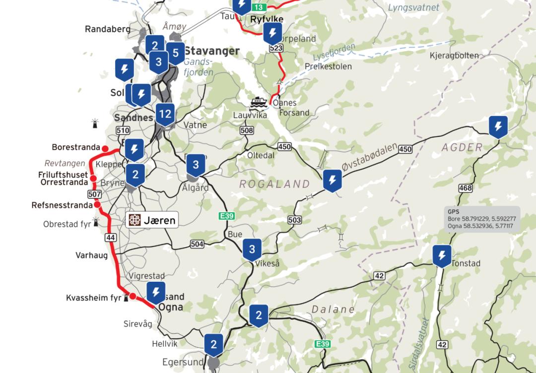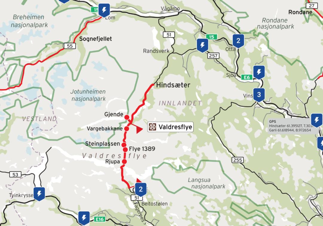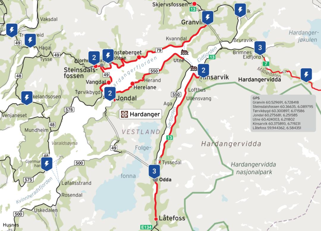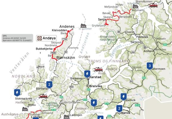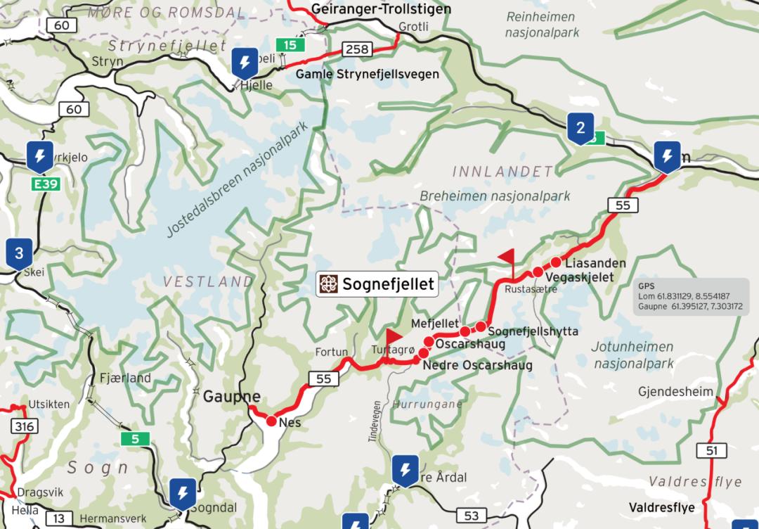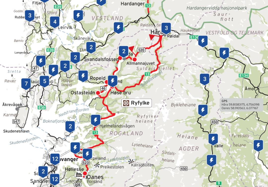 清洁能源的电车在挪威使用率极高,地图中标注了在此路线中可供电车充电的充电桩位置。Photo: norwegianscenicroutes