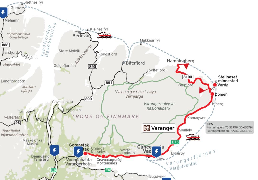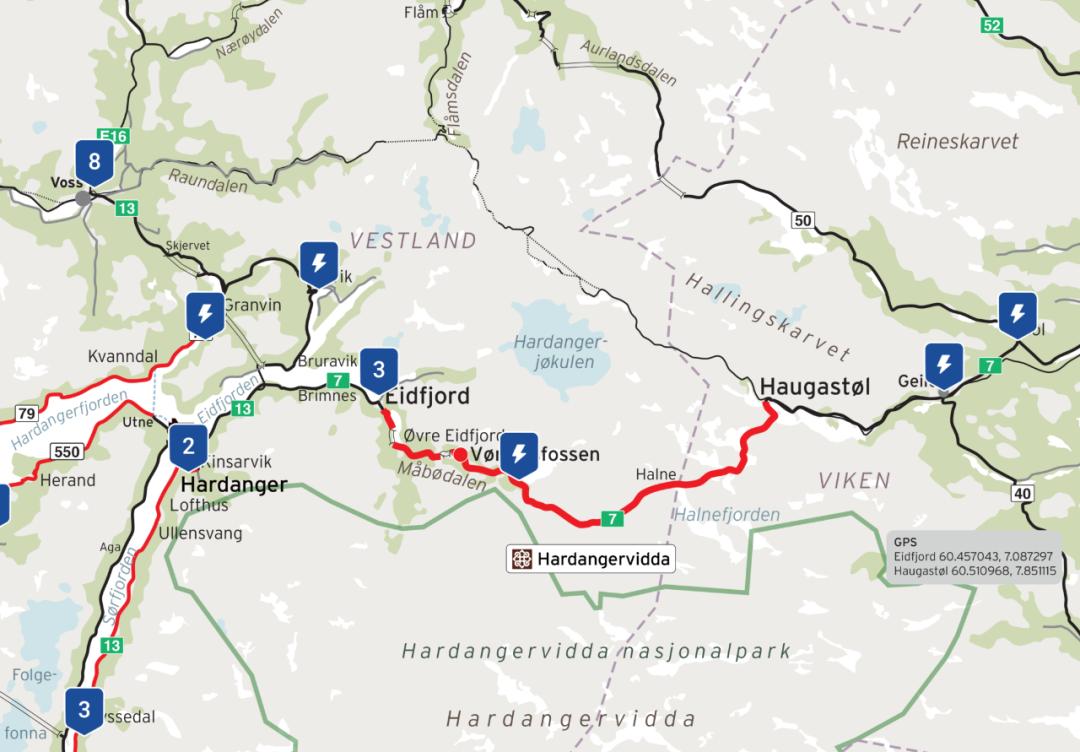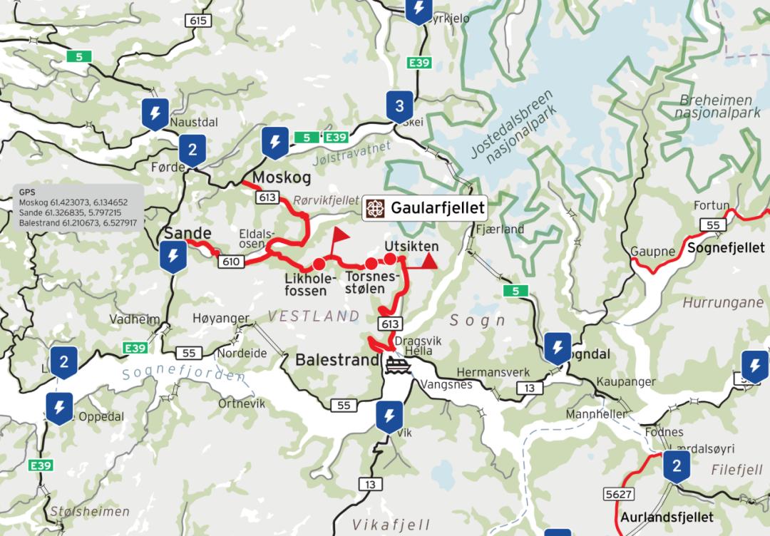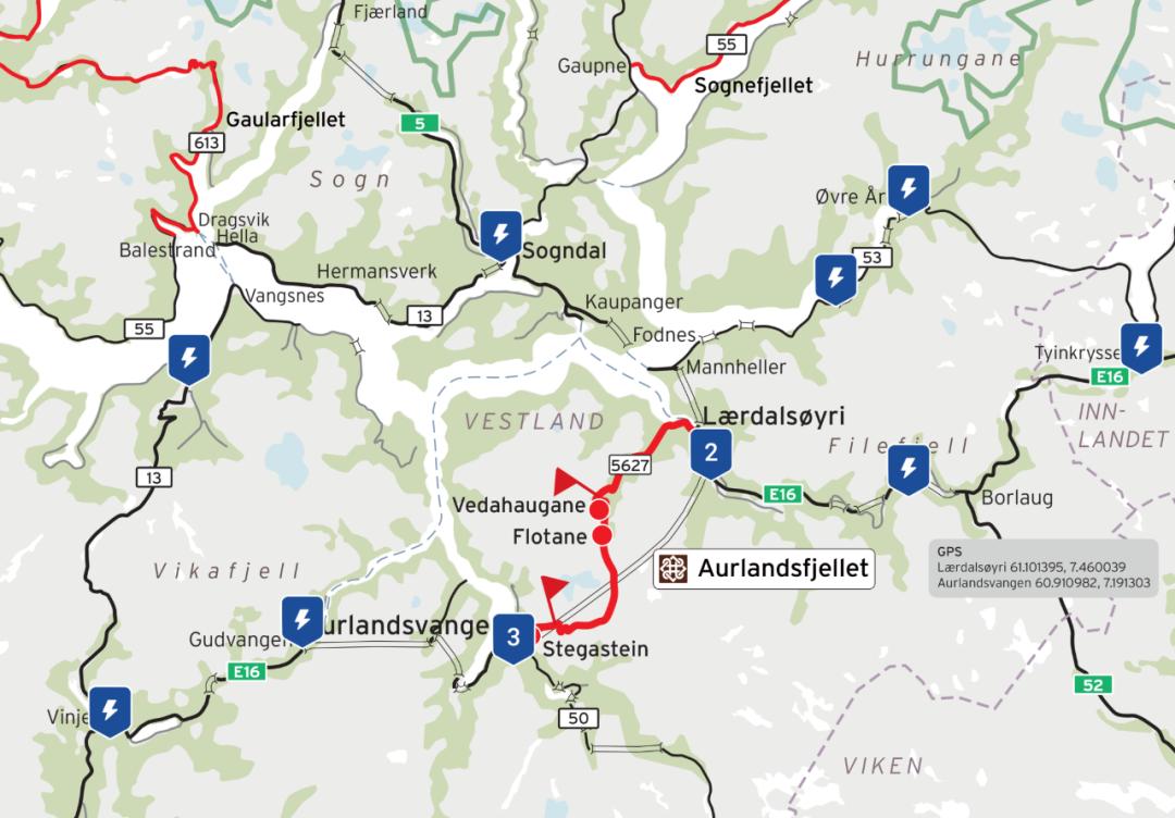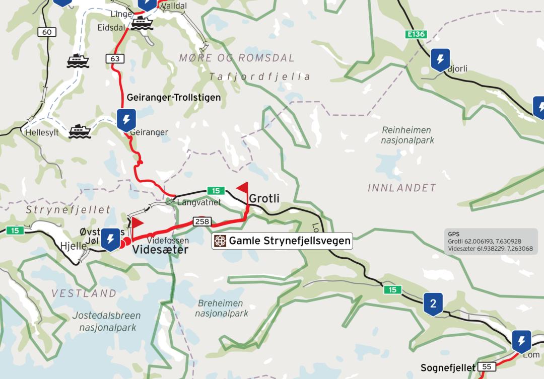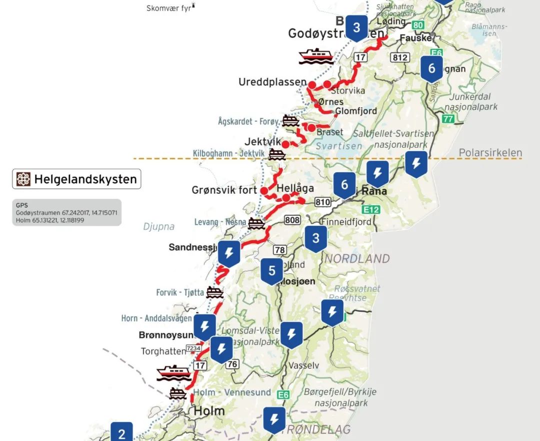清洁能源的电车在挪威使用率极高,地图中标注了在此路线中可供电车充电的充电桩位置。Photo: norwegianscenicroutes