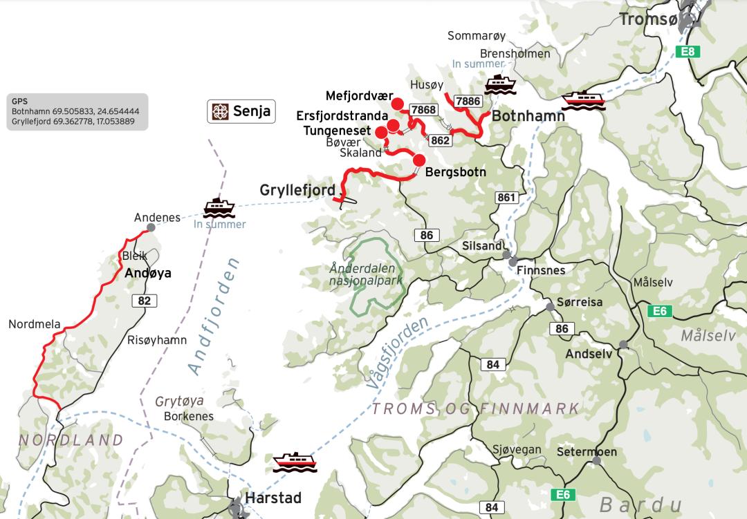 Photo: ins@tilbringferieninorge这条线路的起终点分别在Gryllefjord和Botnhamn,主要途经86/882号公路,全程102公里,最高海拔287米。沿途主要景点包括Ersfjordstranda沙滩小屋、Tungeneset观景台、Husøy渔港、Bergsbotn观景台。