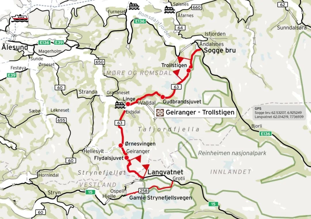 Photo: norwegianscenicroutes这条线路的起终点分别在Langvatnet和Sogge Bru,主要途经63号公路,全程104公里,最高海拔1,038米。在Eidsdal和Linge之间有轮渡,Langevatnet至Geiranger段以及Trollstigen段在冬季会关闭,关闭时间一般在10月、11月到次年5月。