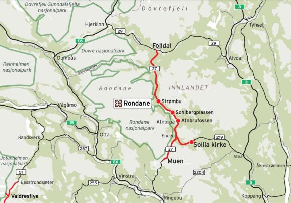 Photo: Werner Harstad, Statens vegvesen这条线路的起终点分别在Venabygdsfjellet到Folldal(主要途经27号公路)以及Sollia kirke到Enden(主要途经219号公路),全程75公里,最高海拔1,060米。这条公路在每年的10月至次年6月中都会关闭。