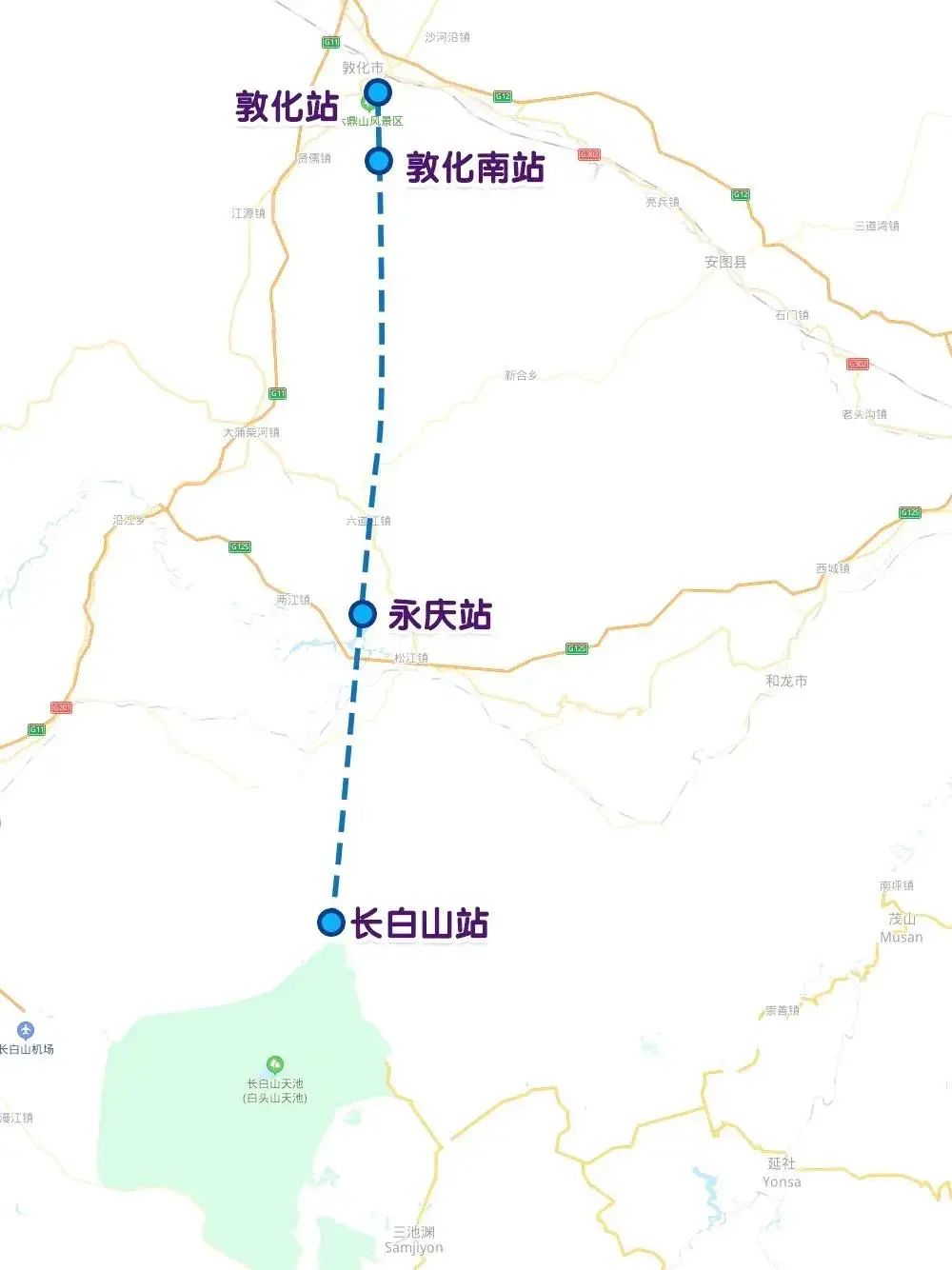 沈佳高铁白敦段全长113公里,设计时速250公里,位于吉林省延边朝鲜族自治州境内,自长白山站引出,途经永庆、敦化南,在敦化站接入长珲高铁。