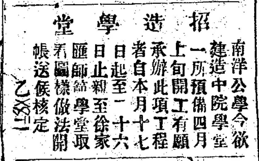 1898年5月7日《申报》刊发的南洋公学“招造学堂”公告,其中提到“建造中院学堂一所”公学的外院停办以后,由于当时上海新式小学堂很少,南洋公学的中院又感到生源匮乏,影响公学的质量,于是又提出重新设立附属小学,可以改称为“下院”,招收高小学生。