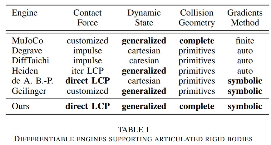 下表 I 展示了几个可微物理引擎的差异,这些引擎已经展示了「模拟有接触铰接刚体」的能力。基于每个引擎各自支持的功能,计算梯度的方法可以分为这几类,分别是有限差分、自动微分、符号微分以及利用神经网络来近似物理。