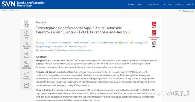 Stroke & Vascular Neurology(SVN)最新上线文章“Tenecteplase Reperfusion therapy in Acute ischaemic Cerebrovascular Events-II (TRACE II): rationale and design”,由首都医科大学附属北京天坛医院、国家神经系统疾病临床医学研究中心王拥军教授牵头(principal investigator, PI),计划在70家卒中中心历时32个月完成。替奈普酶(TNK)是一种基因工程改良的阿替普酶(rt-PA),具有单次静脉推注给药,高纤维蛋白特异性和强纤溶酶原激活物抑制剂(PAR-I)抵抗的药理学特点。在中国,重组人TNK组织型注射型纤溶酶原激活剂(rhTNK-tPA)被批准用于急性心肌梗死AMI适应症。