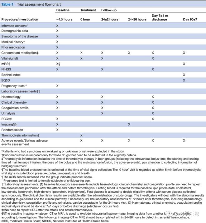 本研究计划纳入1364例受试者,按1:1随机分为rhTNK-tPA 0.25mg/kg组和rt-PA 0.9mg/kg组。主要有效性终点为90天mRS评分≤1分的比例。次要有效性终点包括90天mRS评分≤2分的比例、mRS的秩序分析、NIHSS评分≤1分或较基线减少4分及以上的比例、Barthel指数≥95分的比例。安全性终点为36小时内症状性颅内出血发生率(按照ECASSIII定义和SITS定义)、系统性出血(按照GUSTO定义)全因死亡发生率以及严重不良事件。研究设立国际化学术委员会,独立数据安全委员会(iDMC)以及事件仲裁委员会(CMC)。