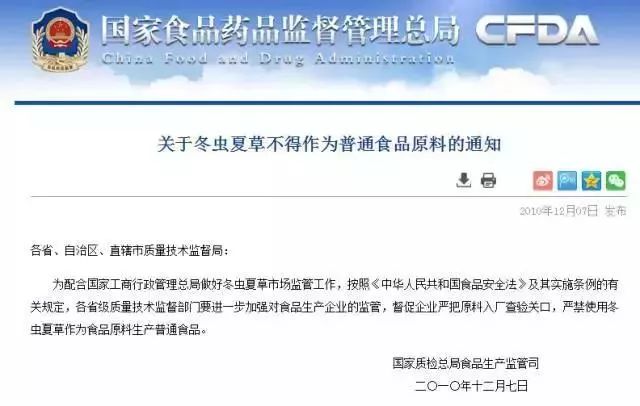 国家食药监总局提醒称,冬虫夏草属中药材,不属于药食两用物质。有关专家分析研判,保健食品国家安全标准中砷限量值为1.0mg/kg,长期食用冬虫夏草、冬虫夏草粉及纯粉片等产品会造成砷过量摄入,并可能在人体内蓄积,存在较高风险。所以购买之前