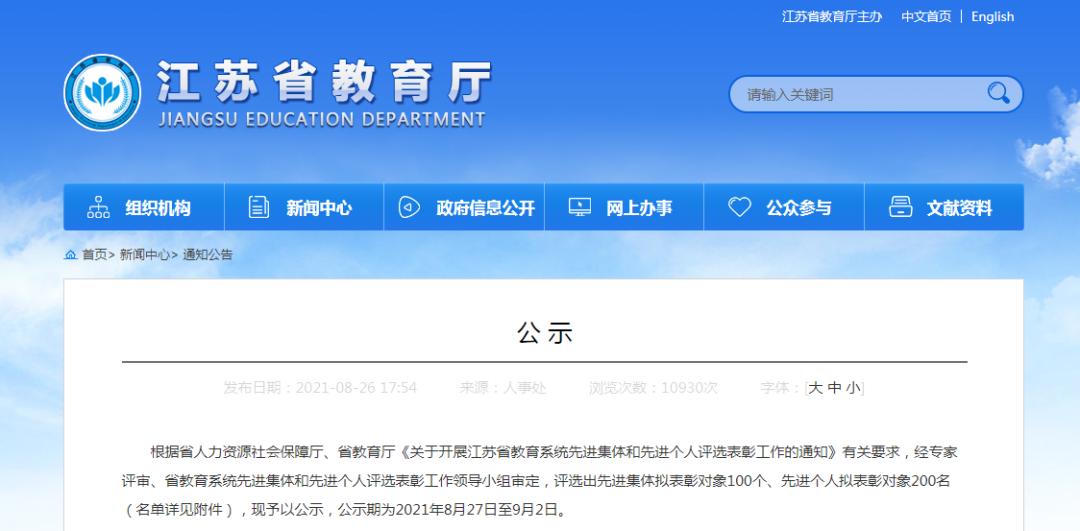 根据省人力资源社会保障厅、省教育厅《关于开展江苏省教育系统先进集体和先进个人评选表彰工作的通知》有关要求,经专家评审、省教育系统先进集体和先进个人评选表彰工作领导小组审定,评选出先进集体拟表彰对象100个、先进个人拟表彰对象200名,现予以公示,公示期为2021年8月27日至9月2日。