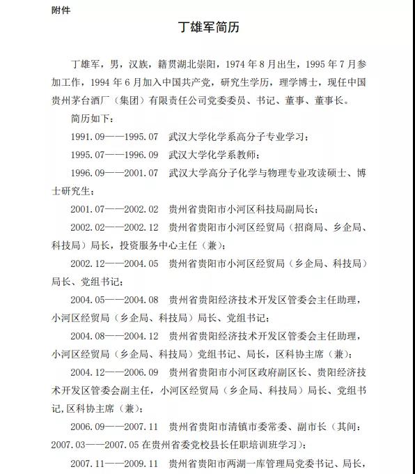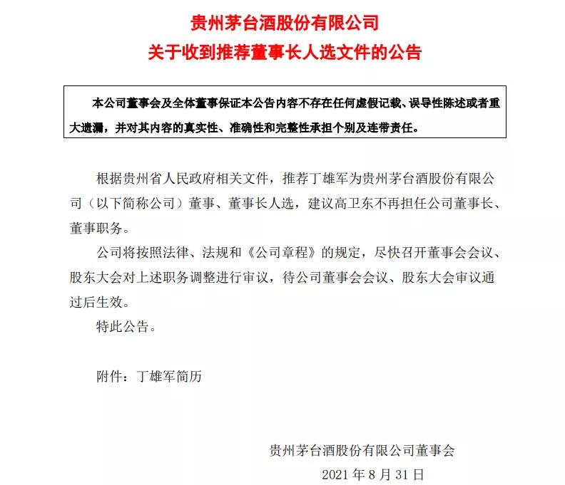 8月30日晚间,贵州茅台发布相关公告称,根据贵州省人民政府相关文件,推荐丁雄军为贵州茅台酒股份有限公司董事、董事长人选,建议高卫东不再担任公司董事长、董事职务。该公司将按照法律、法规和《公司章程》的规定,尽快召开董事会会议、股东大会对上述职务调整进行审议,待公司董事会会议、股东大会审议通过后生效。