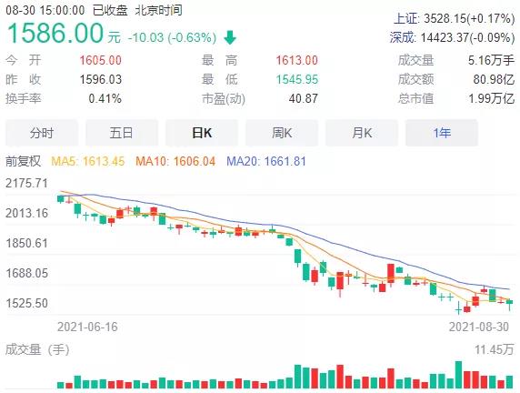 随后,贵州茅台股价又一路震荡回调。8月30日,贵州茅台报收1586元/股,市值为1.99万亿元。