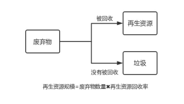 再生资源的源头是废弃物。废弃物是指人们在生产,生活和其他活动过程中产生的丧失原有的利用价值或者虽未丧失利用价值但被抛弃或者放弃物品。这些废弃物中被重新回收和利用的部分成为了再生资源,而剩余没有被回收利用的部分则成为垃圾,一般用填埋、焚烧或者堆肥等方式进行处置。再生资源的规模取决于废弃物数量和废弃物的回收率两个要素。