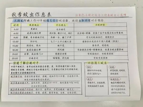 超市阿姨自制秋蚊子作息表这份《秋季蚊虫作息表》的制作者是一位有着13年专业防虫害经验的超市阿姨,表里细数了蚊子一天的行为特点。