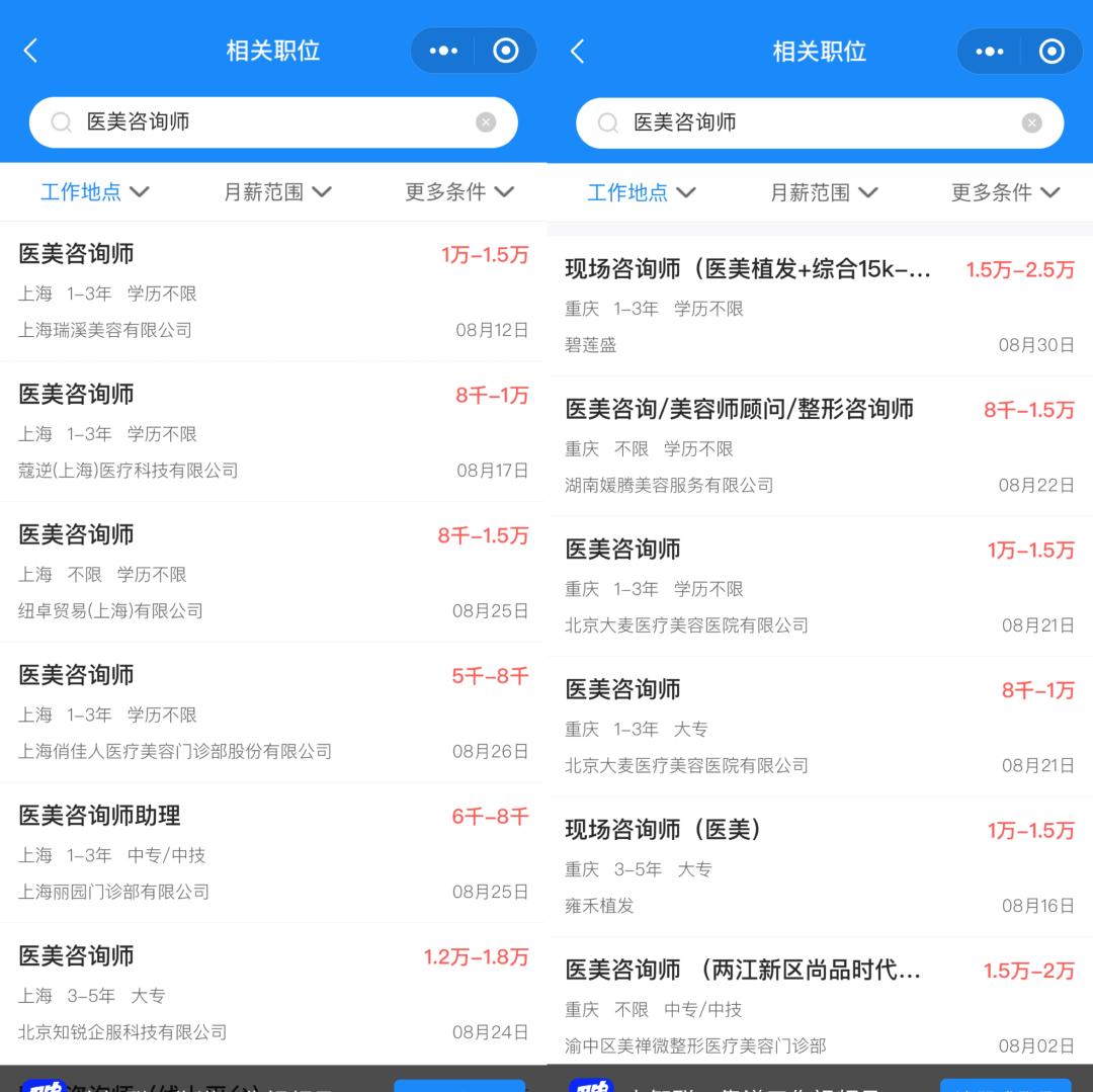 锌刻度查询发现,很多医美公司的医美咨询岗位,就职条件不高,单位对应聘者都没有学历要求,也很少设置医学或护理学等专业门槛,反而更加看重销售、沟通交际等能力。