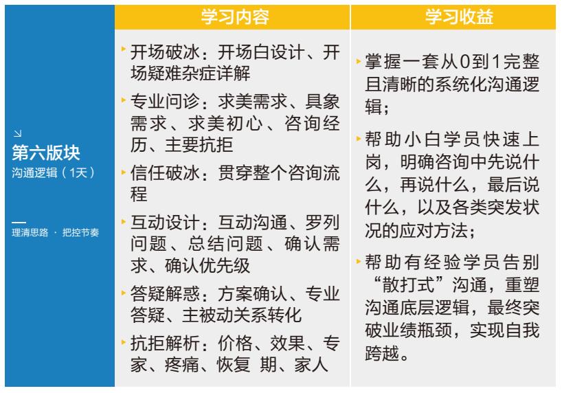 某医美咨询培训班的部分课程内容另一个比较重要的课程内容是沟通逻辑,这一部分不仅有资深医美咨询师授课,还有一本专门的话术教材供学员使用。举个简单的活用例子,通常情况下,消费者到院首先是登记并在前台分诊,然后前往咨询室了解相关项目,医美咨询师就从这个环节开始参与其中,看实际情况发挥自己的作用。