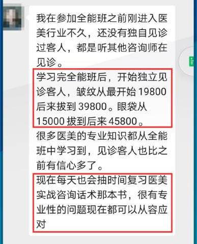 培训老师发给杨丽丽的成功案例多番劝说下,杨丽丽暂时放下了戒备,准备抽个空闲时间去培训班实地考察一下,“不管他们的真实教学水平怎么样,医美咨询师这个职业实在太香了,值得试一试。”