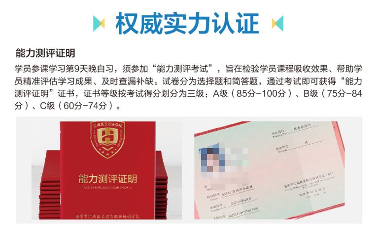 为了增加学员在毕业之后的竞争力,万奇的医美咨询师培训班,专门准备了和毕业证书配套的能力测评证书。不像毕业合格证书只要按时参课、不早退就可以顺利获得,能力测评需要在课程结束之后通过考试才能获得,“我们的能力测评证明是分为A/B/C三个等级,正常情况下都是B级。”