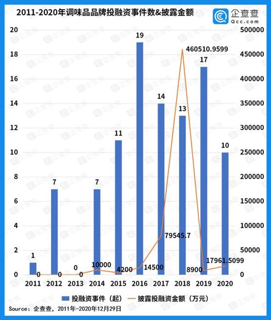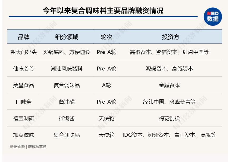 这样一本万利的生意必然会吸引大量一级市场资本闻风而动。高榕资本投资朝天门码头,高瓴天使轮投资了“加点滋味”,经纬中国投资了“口味全”。2019年作为海天味业估值巅峰,一级市场的当年披露的投融资金额也将近46亿人民币。