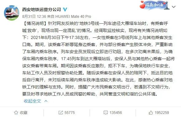 针对网友反映的“地铁3号线一列车途径大雁塔车站时,有乘客呼喊‘救命’,现场出现一定混乱”的情况。经调取监控核实,现将有关情况说明如下:2021年8月30日下午17:38左右,一女性乘客在3号线列车上与其他乘客发生口角。