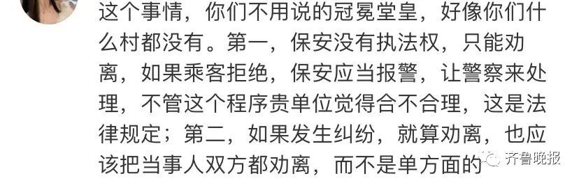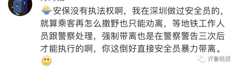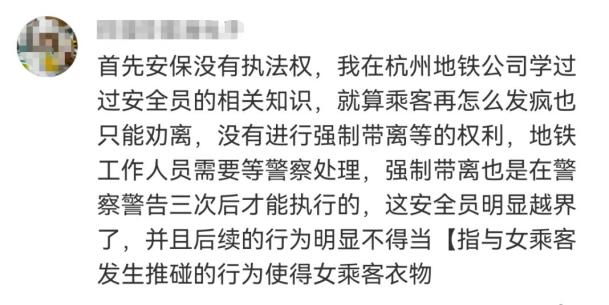 针对地铁安保人员强制带离的行为,蓝天彬律师表示,地铁安保人员没有强制请乘客下车的权力,这涉及公民的人身权利的问题,应该由公安机关实施,并由公安机关针对乘客是否违反《治安管理处罚法》,决定是否进行行政处罚。