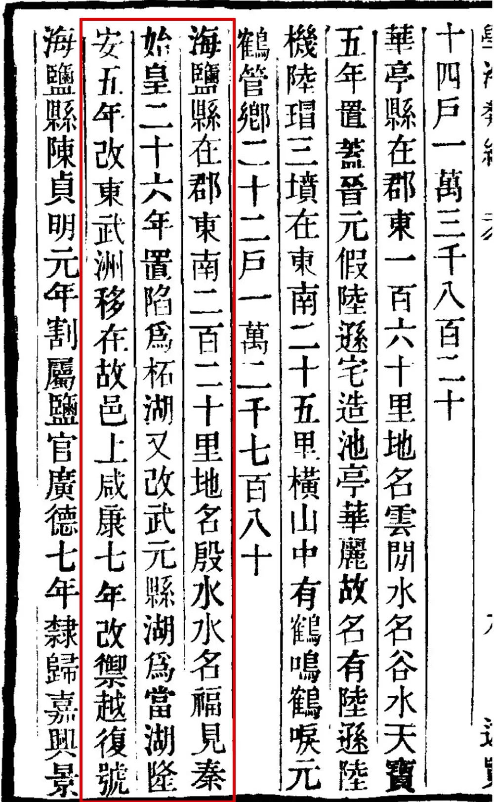 前文所据,武原乡于汉安帝时再次沦湖,则海盐迁武原必在此前,汉安帝在位时间为107—125年。另,早于《水经注》并大体被认为成书于东汉的《越绝书》在卷二《记吴地传》中有“海盐县,始为武原乡。”卷八《记地传》中有“觐乡北有武原。武原,今海盐。”等句,也可说明海盐迁武原在东汉之前即已发生。又《汉书》卷28《地理志》“会稽郡”条:“海盐,故武原乡。有盐官。莽曰展武。”考订海盐县城迁武原乡是在《汉书·地理志》撰成之前。《汉书·地理志》所用原始材料多是元始二年(2年)簿籍,并且文内称“故武原乡”,可见“海盐迁武原”一事对班固来说已是年久日长,不可胜知了。所以,柘湖成湖时间的下限在公元2年之前。