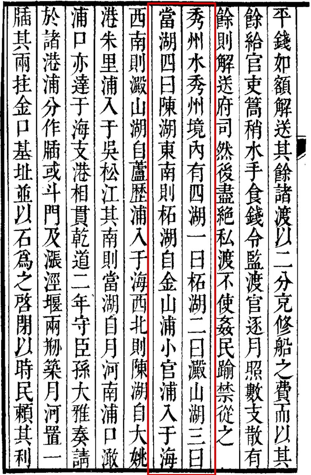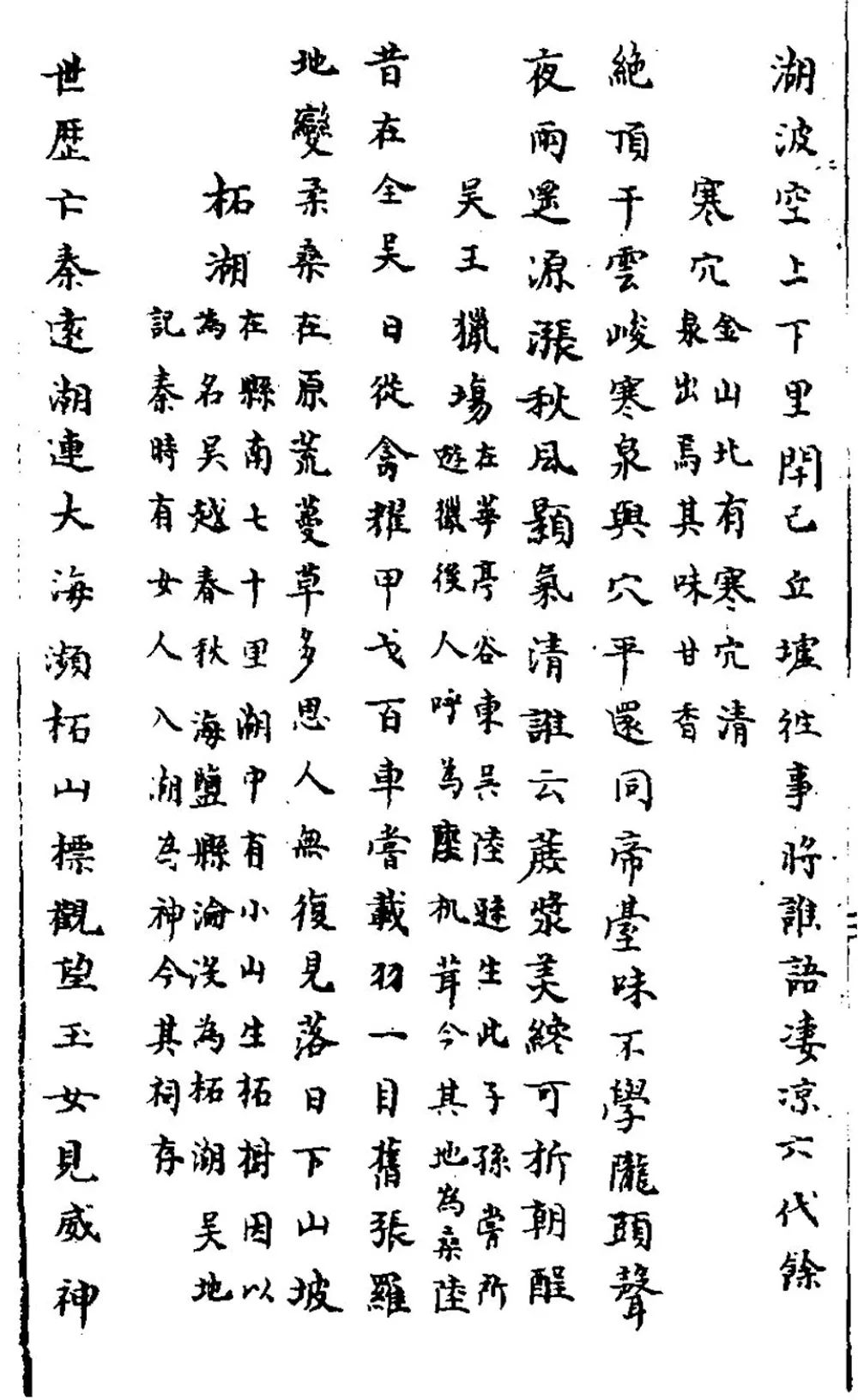 柘湖现存史料不多,早先见于《水经注》《元和郡县志》等书,言辞多简略,只是在记述海盐县沿革时提到“海盐沦入柘湖”一事。至宋代,有关柘湖的史料开始略微丰富,《舆地纪胜》《方舆胜览》等总志中都有所见,《绍熙云间志》中的柘湖材料相对来说最为详细。《宋史》中亦有多处提到柘湖,保留了些当时治湖的宝贵材料。元代及明清文献中的材料多抄录旧志,无甚新意,但《吴中水利全书》《三吴水考》等水利集丛对文献多有保存之功。