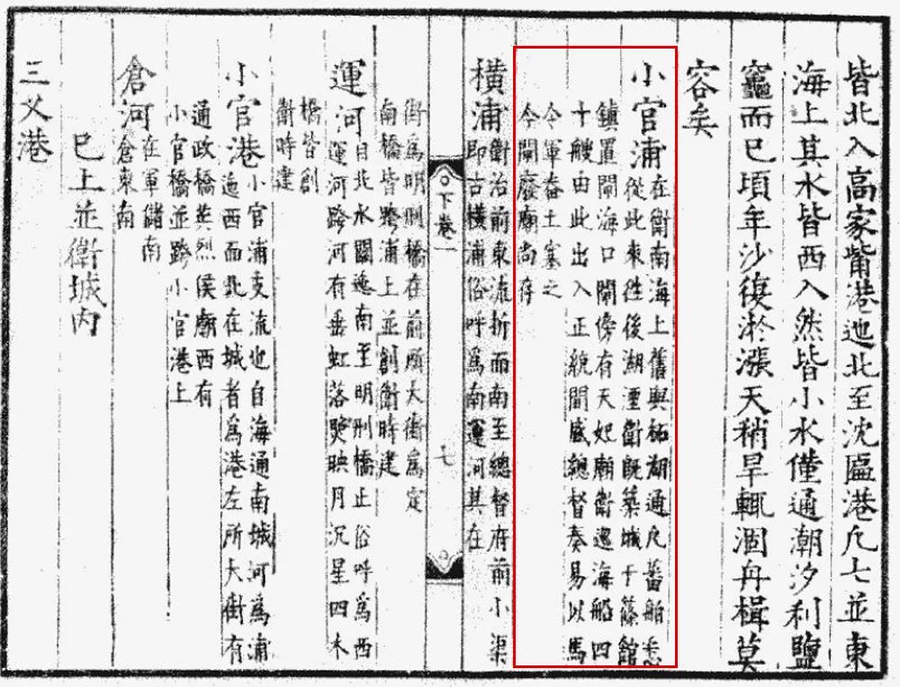 小官浦,正德《金山卫志》记:“在卫南海上,旧与柘湖同,凡蕃舶悉从此来往,后湖湮。”又有“小官港。小官浦支流也。自海通南城河为浦,迤西而北在城者为港。”可知小官浦明代被金山卫城墙截断,城内称港,城外仍称浦。查考旧地图,小官浦港大致为南北向,在今学府路东侧,至施二路转东,又在施三路转南,一直向南入海。