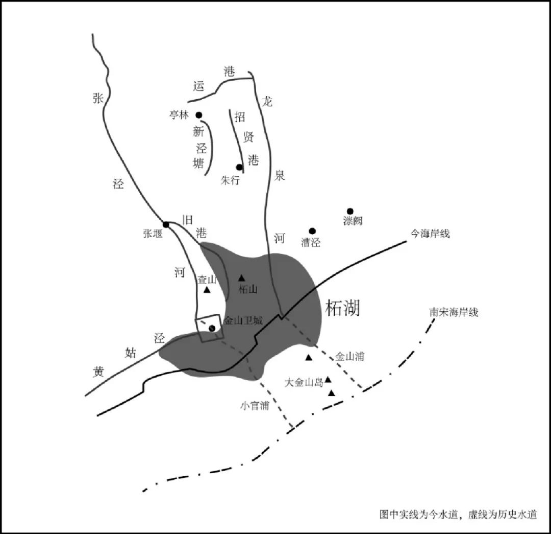 推定出柘湖处于大金山岛与金山卫城之间只是一个大略位置,若从出入湖水道的位置着手,就能复原出该湖的具体岸线。