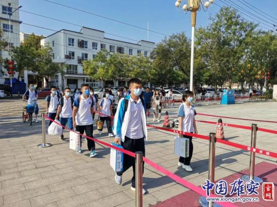 图为雄安新区雄县第三高级中学学生返校现场。中国雄安官网毛鹤然 摄9月1日上午7点半,雄县第三高级中学学生开始陆续返校。据悉,在学生返校前,学校按照要求对学生们进行了两次核酸检测,并在返校当天对每一名返校学生进行体温检测。