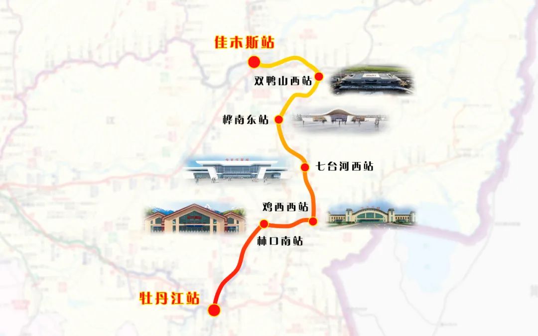 牡佳高铁中间站,位于佳木斯市桦南县东侧约4公里处,建筑面积3000平方米。车站设计以“七星精神、美丽桦南”为设计理念,外观将桦南历史悠久的文化底蕴与壮丽秀美的自然风光特色完美融合。