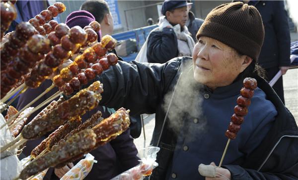 为什么非得拉一下呢?开头咱们不是说了吗,每串糖葫芦,前头都有伸出去的那么一片糖。这片糖,靠的就是这么一拉。寒冬腊月,熬糖的锅,呼呼呼,往外直冒热气,离着老远就能闻见一股焦糖味儿。