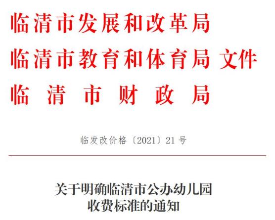 <山东省定价目录>的通知》(鲁发改价格〔2020〕1361号)的管理权限和《聊城市发展和改革委员会聊城市教育和体育局聊城市财政局关于贯彻实施<山东省幼儿园收费管理办法>有关问题的通知》(聊发改成本〔2020〕48号)文件精神,充分考虑我市经济发展水平、群众承受能力和办园成本,依据成本调查的情况,经市政府同意,对临清市公办幼儿园收费标准通知如下:山东省幼儿园收费管理办法>山东省定价目录>