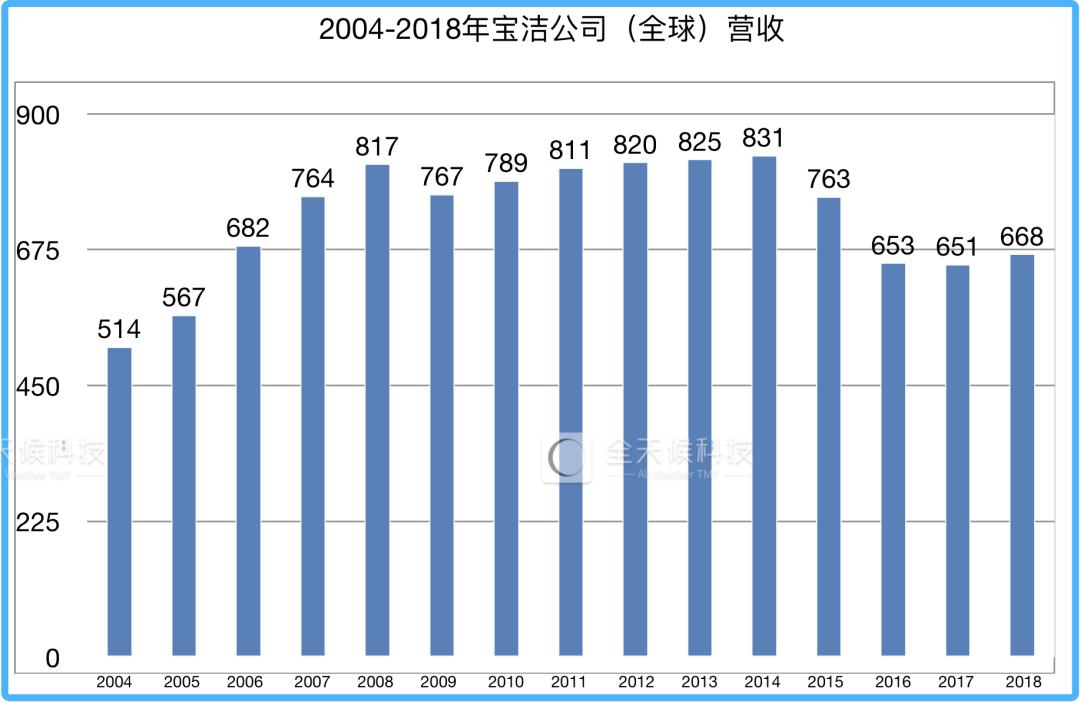 财报显示,2004-2008年是宝洁的快速上升期,营收增长近六成;之后的六年里(2008-2014年),宝洁处于相对平缓、小幅波动的状态,全年营收基本在800亿美元上下;到了2015年,营收较明显下滑,并开始走向下坡;2016年的业绩已经倒退回到了十年前——2006年的水平。