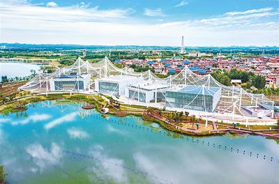 ▲8月26日,坐落于邯郸市复兴区的省第四届园林博览会园博园标志性建筑——山水邯郸主场馆,在蓝天白云下显得分外亮丽。董 源摄