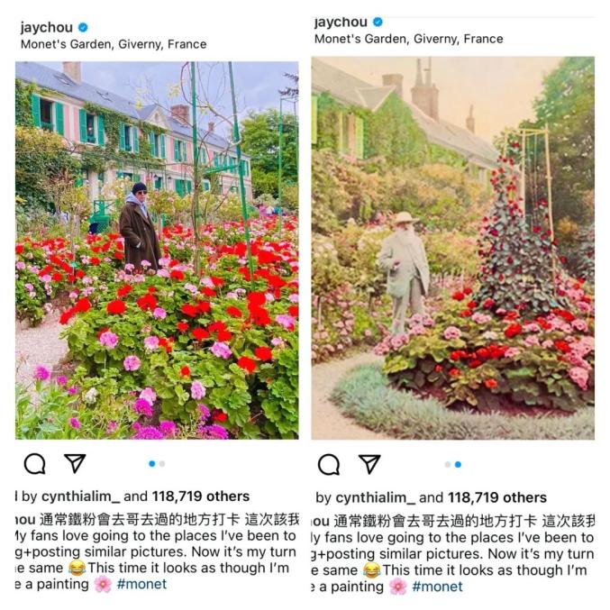 Jay的粉丝们都会打卡他在MV中的同款拍摄地,周杰伦也会学习粉丝的拍摄方式追随自己喜爱的印象派画家莫奈大师拍摄极具仪式感的照片。