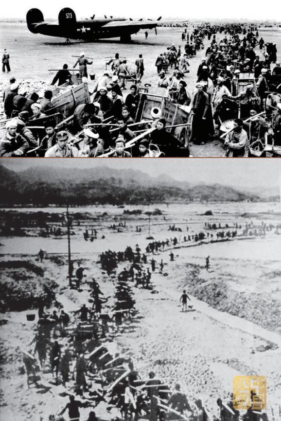 △ 以应抗战之需,1945年3月17日,来自泸县、合江、叙永、富顺、隆昌、江津、荣昌等地的85500名民工开始修建蓝田机场;6月1日,蓝田机场竣工,创造了航空史上的奇迹。蓝田机场是中国第一个混凝土跑道机场,因为特殊的地理位置,后来很快成为驼峰航线上的主要机场之一。图为1945年修建中的蓝田机场。