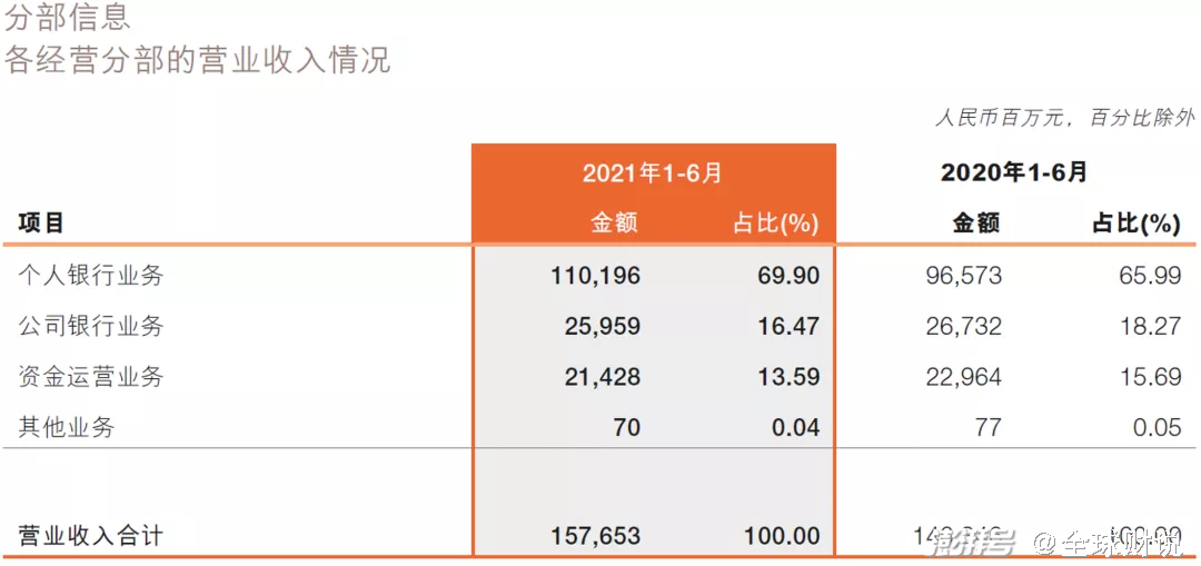 从各经营分部的营业收入情况看,该行个人银行业务占比最高,上半年该行个人银行业务收入在营收中占比达69.9%,即近7成,公司银行业务收入占比甚至还有微降,占比还不到2成。