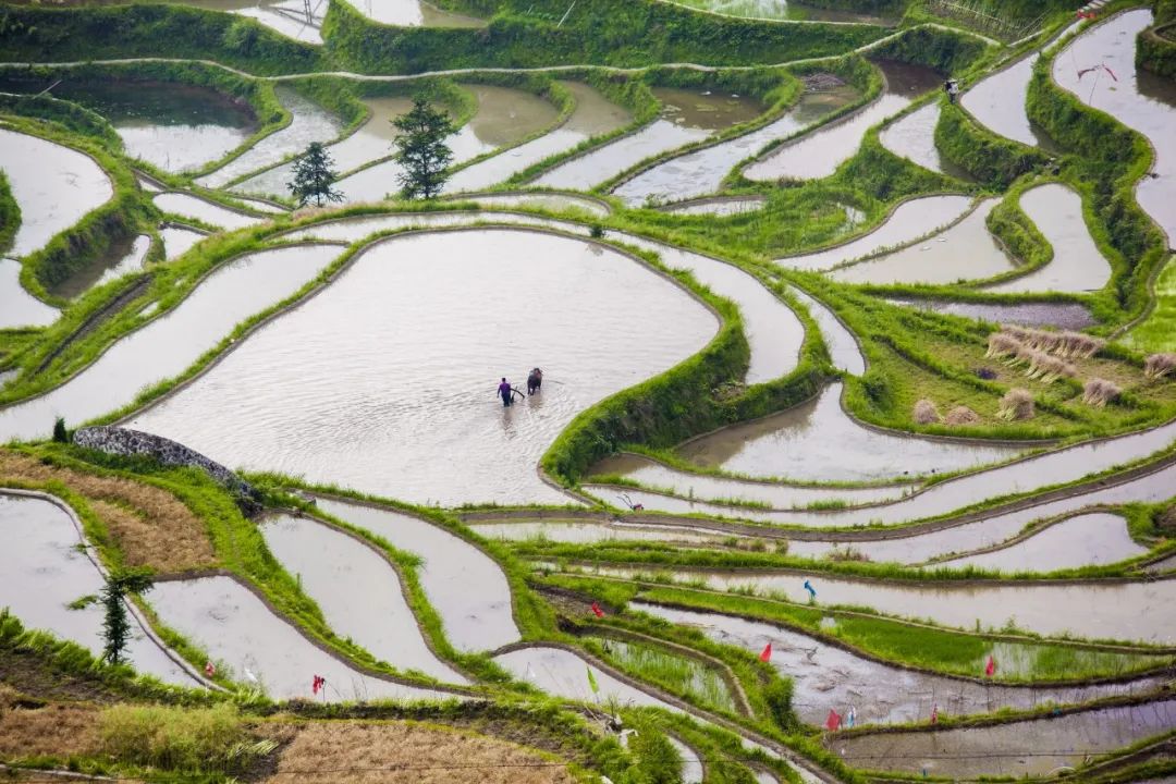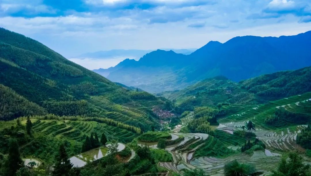 一个又一个行人,像她一样徜徉在山顶,俯瞰着脚下的万亩梯田。倒映着明亮天光的梯田,龙鳞般蜿蜒盘旋,闪闪发亮,绮丽静谧,如梦境幻影。在光晕的作用下,人们的眼前浮现了四季不同色彩的画面:“春来水满田畴,如串串银链挂山间;夏至佳禾吐翠,似层层绿浪排苍穹;金秋稻穗沉甸,像座座金塔顶玉宇;隆冬雪兆丰年,若环环白玉砌云端。”文字中呈现的静态画面在她眼里渐渐动了起来,然后有了声音,气味,来源和去向。梯田中最明亮的部分是水,来自高山丘陵谷地的山林和竹海,来自潺潺溪流,来自瀑布,还来自梯田本身,蒸发而成的水汽,在风的引领下,变成云,变成雨,落入梯田,填满每一道干渴的缝隙。如此,缭绕,循环,往复,如一个生命体的呼吸。