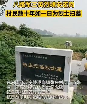 7)商丘市宁陵县逻岗镇张庄村西北角100米处,有一座高耸挺立的烈士纪念碑,纪念碑北侧安葬着三位抗日战争时期牺牲的八路军战士,村民们数十年如一日为烈士扫墓。